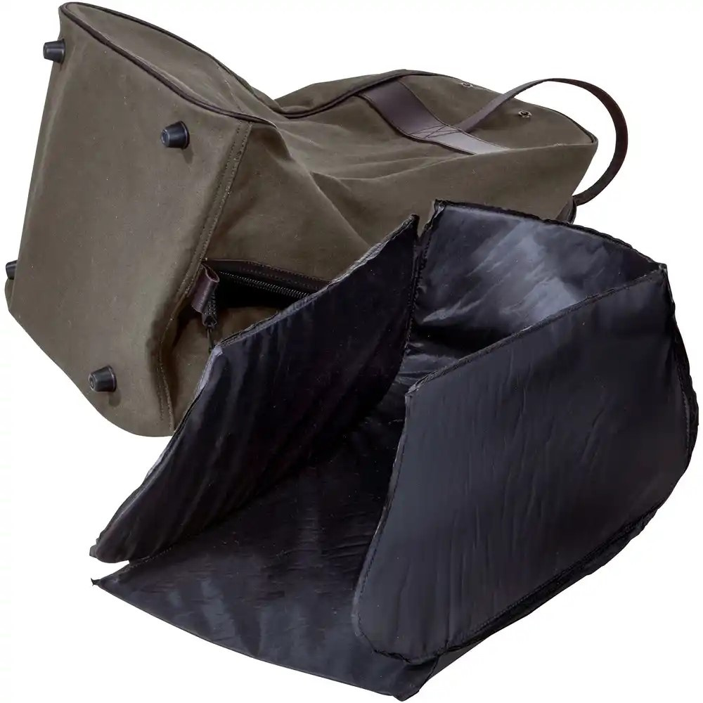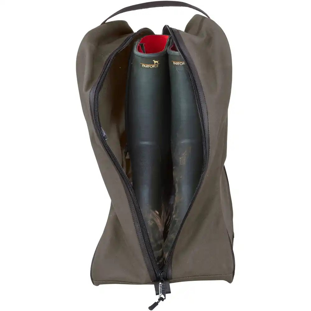 A robusztus csizmatáska vízlepergető poliészter anyagból készült, és helyet biztosít egy pár gumicsizma vagy vadászcsizma számára. Ideális szállításhoz vagy autóban való tároláshoz. A táska rugalmas alja könnyen levehető és megkönnyíti a tisztítást. Praktikus, kétirányú cipzárral.