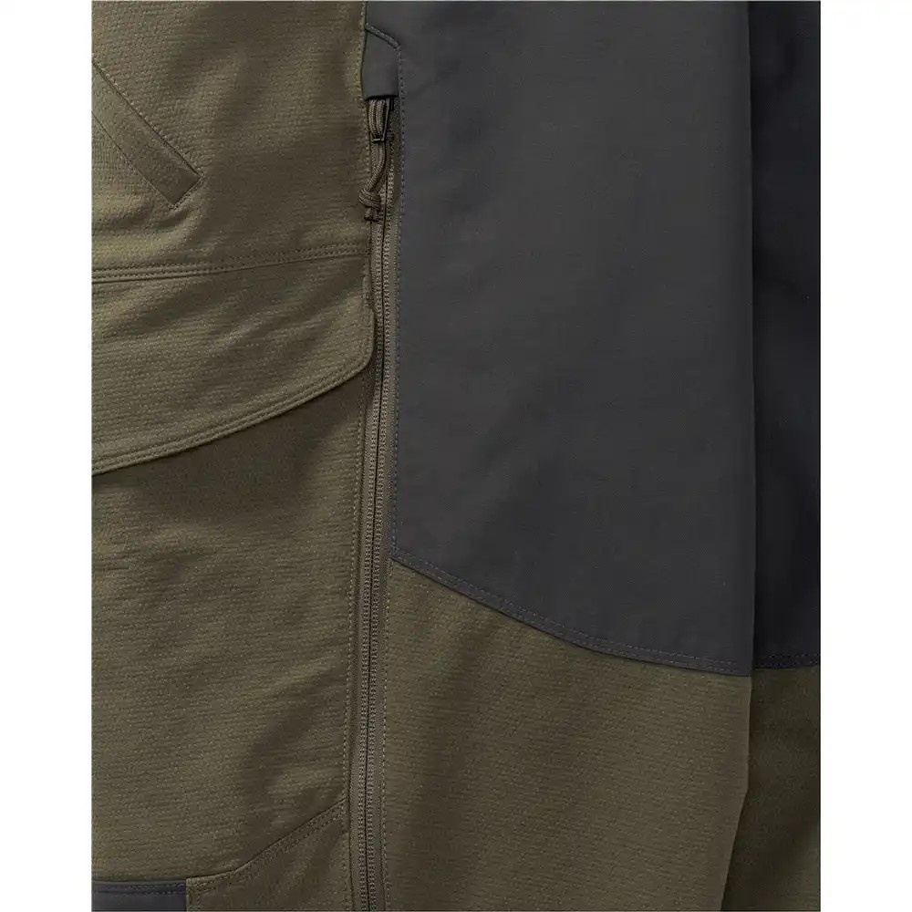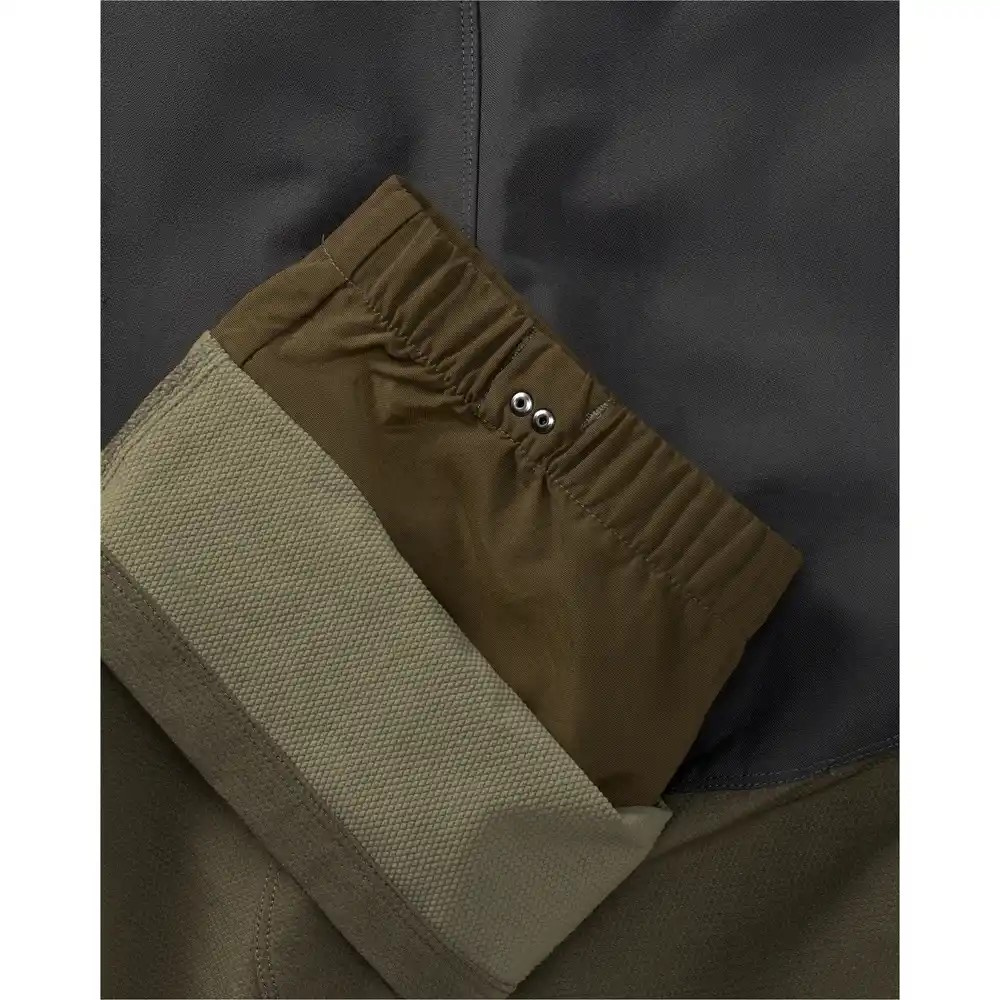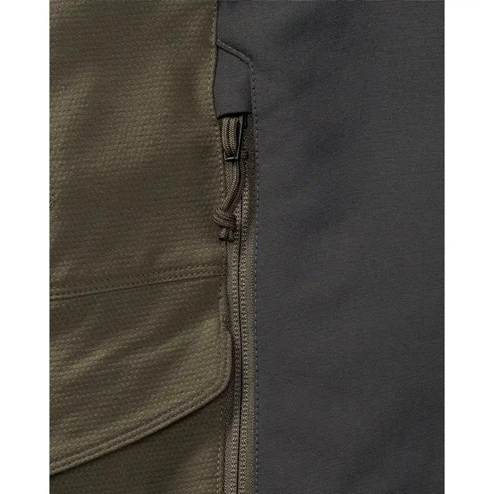 Mindkét rakományzseb elő van készítve a mellékelt töltényfolt számára. A jobb oldali rakományzsebben egy nagyméretű, szegélyezett zseb is található. A 44 cm hosszú (!) oldalsó szellőzőcipzárak, amelyek a térdhajlatig érnek, az YKK® önzáró félautomata cipzárjaival biztosítják a szükséges légáramlást a megerőltető vadászatokhoz vagy a vadmentéshez, és új mércét állítanak fel a vadászpiacon a teljesítmény tekintetében. A nadrág szárának végei szorosan illeszkedő, integrált belső lábszárvédővel rendelkeznek, amely erős, impregnált és könnyű, hó és kullancsok elleni védelemmel készült. Egy erős cipőakasztó, amely használaton kívül eltűnik egy szövetfedélben, hogy például a gumicsizmában ne csípődjön be, hegyi csizmához rögzíthető, hogy megakadályozza a nadrágszár "felmászását". A III. generációt szoros, strapabíró fonalból készült dupla varratok tartják össze, és hosszú élettartamot garantálnak. A túlrészben lévő nagyméretű betoldás hosszú távon tehermentesíti az ülepvarrásokat. Súly kb. 490 g.