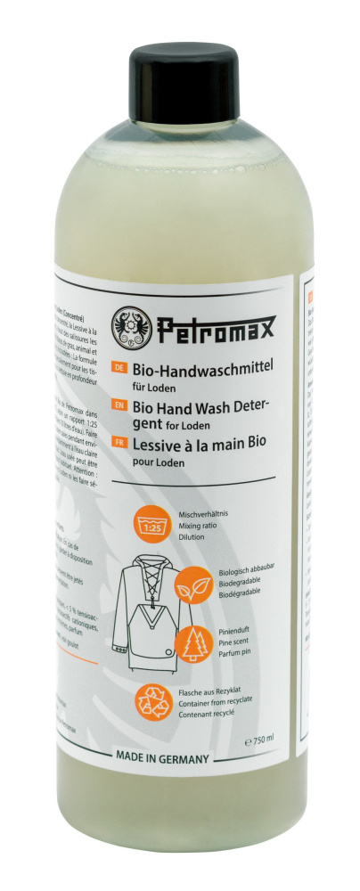 A Petromax Bio Hand Washing Agent egy biológiai koncentrátum Petromax Loden ruházat és más közönséges gyapjú textíliák tisztítására. Lehetővé teszi a szennyeződések és szagok mély hatású eltávolítását. A folyamat során a növényi és állati zsírok teljesen feloldódnak, miközben a gyapjúszálak nem károsodnak. Mosáskor az orrodat és a ruhádat fás fenyőillat kényezteti. A Petromax Bio kézmosót úgy tervezték, hogy fenntartható és környezetbarát legyen, mivel az összetevők teljesen biológiailag lebomlanak, a palack pedig újrahasznosított műanyagból készült.