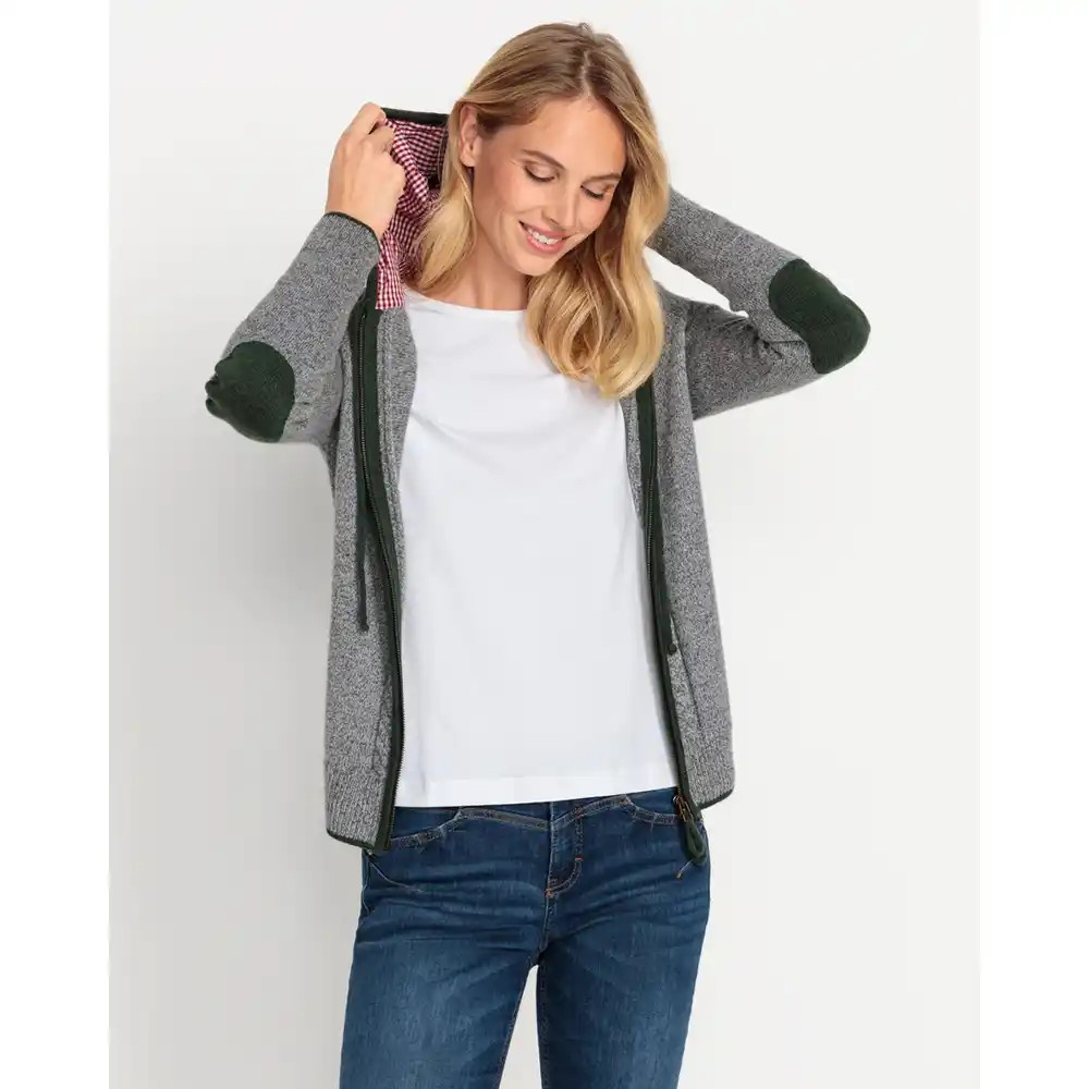 Kellemes kötött minőségben hagyományos női kardigán a REITMAYER márkától. Normál szabással és bélelt gingham kapucnival. A kontrasztos élek és ujjfoltok harmonikusan teszik teljessé a dizájnt. A cipzár oldalán található kidolgozott csavartminta kiemeli a kardigán hagyományos karakterét, hogy sokáig élvezhesse ruhadarabját, íme a gondozási tippek: