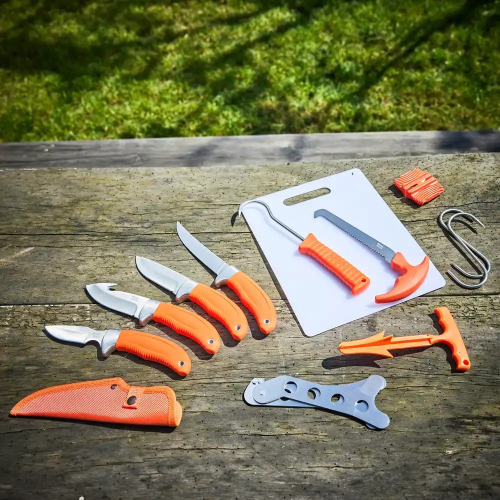 Kiterjedt készlet vadhús feldolgozásához, minden kéznél van, higiénikus, csúszásmentes műanyag fogantyúk praktikus hordtáskában.